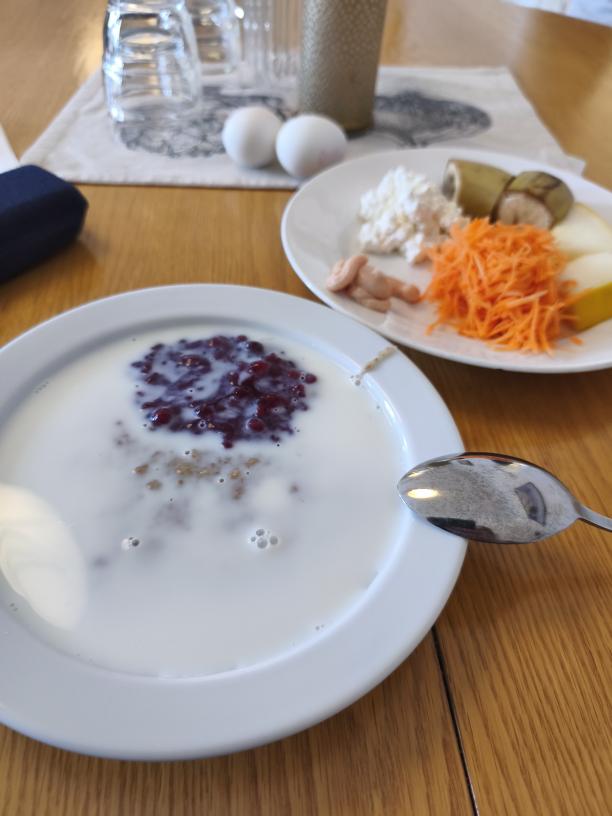 Dagen började med artrosträning 07.15 följt av frukost 08.00. Som vanligt nu i början av mitt nya liv så blev det en klick gröt som jag inte minns namnet på, den osötade lingonsylten gör att de flesta sorters gröt följer med ner nu. Rårivna morötter, en klick keso och 2 ägg+kaviar är mer eller mindre standard nu, sen brukar det alltid finnas frukt modell banan, apelsin, äpple, melon mm.