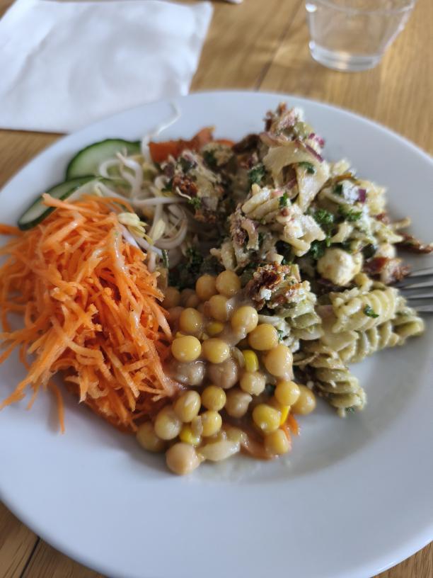 Lunch klockan 12.00, nån pastasallad med bl.a soltorkade tomater, sen variant av ärtsoppa med majs, modell gröt, fast utan fläsk. För ovanlighetens skull tog jag en tuss rårivna morötter till det. 🙂