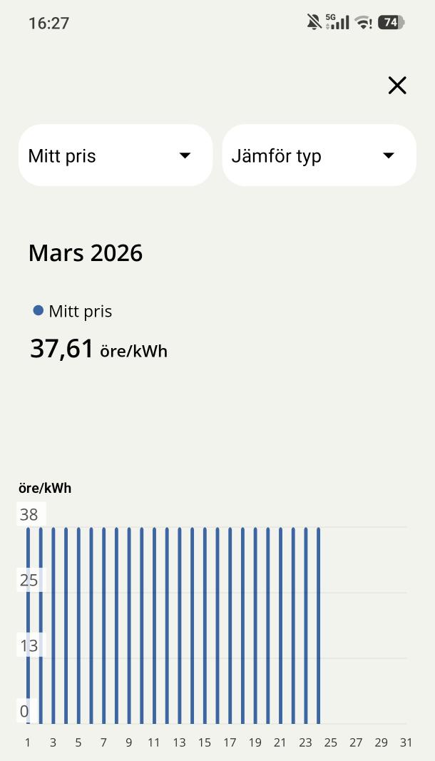 Kikade lite på Fyrfasens hemsida och kikade på elpriset,ser ju riktigt trevligt ut för denna Mars månad just nu.
