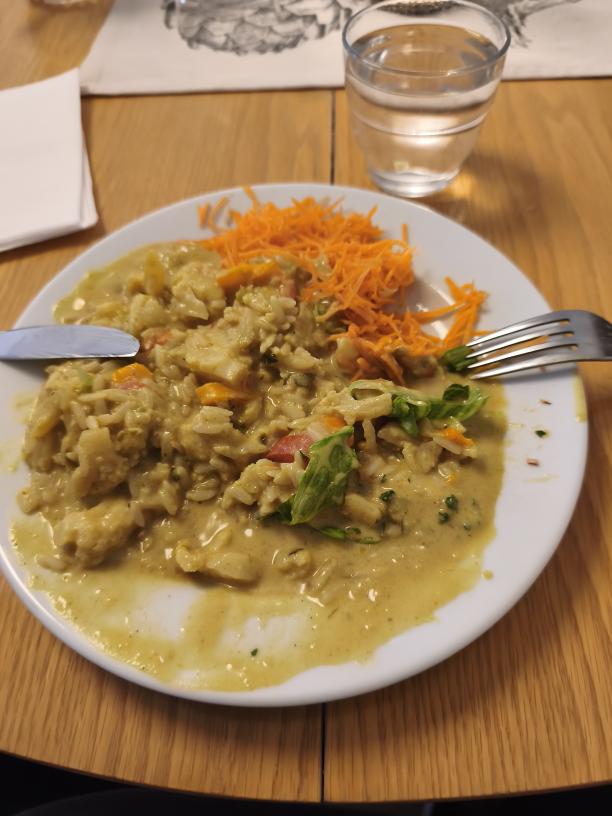 Lagom tills jag klätt duschstången med T-shirts och mysbrallor så var det dags för middag. Man kan väl säga att om man bytt ut blomkålen i denna gryta så hade det blivit en ypperlig currykyckling och råris, dessvärre så var nog kycklingarna på rymmen. Fast det var jäkligt gott ändå måste jag väl inflika även om det ser slaskigt ut på tallriken, såsen var så lös att det höll på att rinna över på vägen till bordet plus att jag försökte mota tillbaks den med gaffeln och hade provsmakat lite.