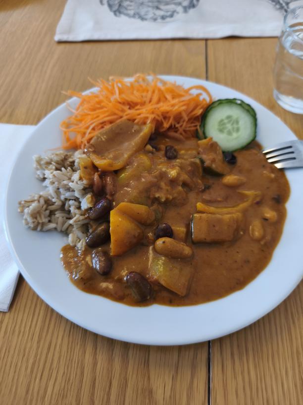 Vaknade lagom till att kila iväg och äta lunch, det var nått fullkornsris och en kryddig böngryta, lite väl kryddig och torr tyckte jag till en början, men den gav med sig under ätandet och kändes ganska ok till slut.