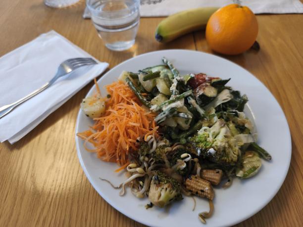Jo, då blev det middag, nån ”Grön gratäng” stod det på skylten. Var broccoli, tomat, massa purjolök mm, var väl sådär tyckte jag. Fanns ju rårivna morötter och lite annat jox som smakade bättre att äta av, men jag åt upp allt iaf.