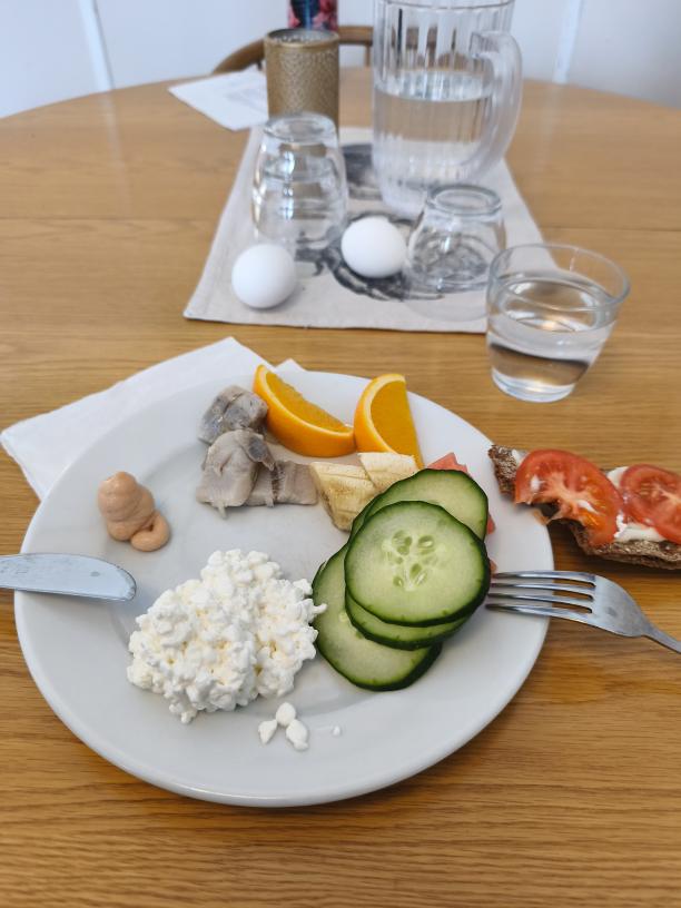 Startade dagen med lite nacke/skuldragympa 07.15 innan frukosten som blev lite blygsam idag också,är ju inte så förtjust i nya okända grötsorter så jag hoppar oftast över det. Men en knäckemacka, ägg, banan, keso, sill, gurka, tomat och apelsin brukar slinka ner följt av kaffe naturligtvis. 😛