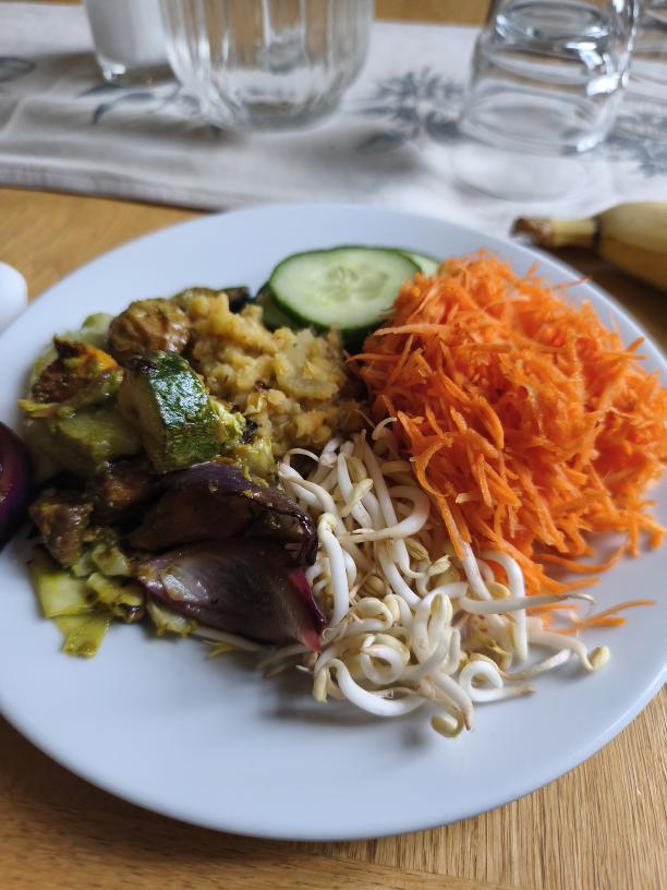 Efter detta var det middag, en morotssoppa som inte lockade mig speciellt, men det finns ju så mycket annat plock man kan stilla sig med så.. Rårivna morötter är en favorit, böngroddar en annan numera 😛