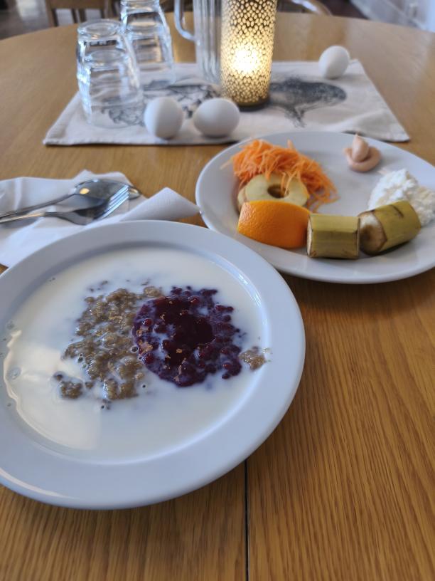 Hoppade över vattenpilates nu på morgonen och tog sovmorgon igen, upp och iväg till frukosten klockan 08.00. Blev nån slags grovmjölsgröt med kanelstång och russin i kändes det som, gick ner utan problem med en rikligt tilltagen klick lingonsylt (Osötad förstås). De numera traditionsenliga 2 äggen och kaviardutten börjar bli obligatorisk likt de rårivna morötterna och kesoklicken. 😛