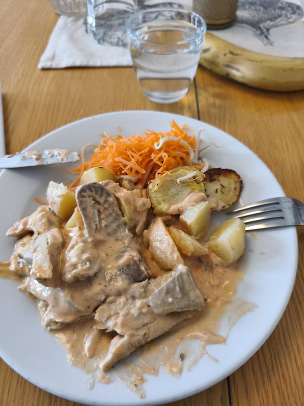 Lunchen bestod av fisk (Sej) i nån sås med en massa ingredienser, bl.a apelsin såg jag, å pärer plus allehanda hälsosamma grönsaker. Fisken var hur som haver jäkligt god och det var en fight att hålla emot att inte gå och backa, har liksom bestämt mig att hur gott det än är så ska jag aldrig backa, det jag tagit på tallriken får räcka oavsett hur gott det är, det plus att äta sakta.